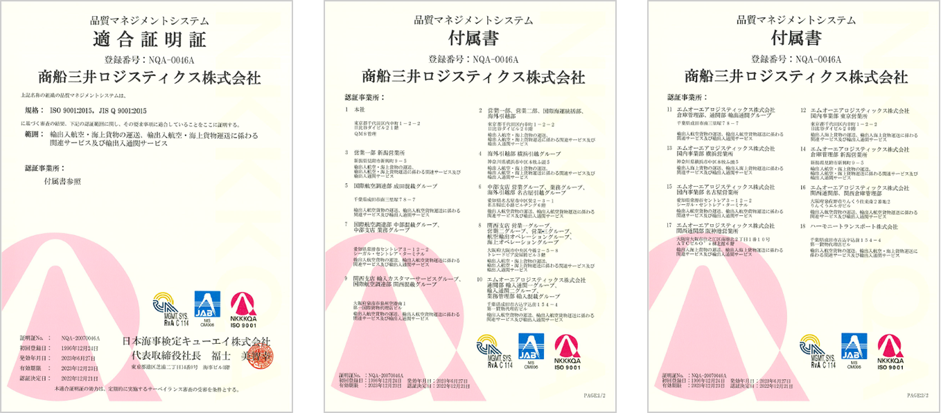 当社は1996年12月、国際標準化機構(ISO)の品質マネジメントシステム規格ISO9002の認証を取得しました。ISOが1987年に定めた国際規格で、認証取得企業の基本的な品質マネジメントシステムの構築、運用を保証するものです。その後2009年12月にISO9001:2008年版への変更を経て2017年12月、ISO 9001:2015への変更登録の承認を受けました。現在、当社輸出・輸入に関わる殆どの拠点が対象となっております。